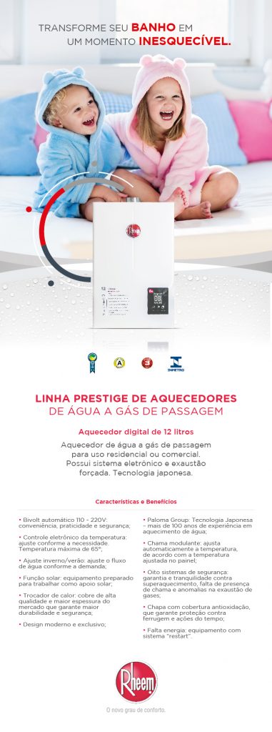 Linha Prestige de aquecedores de água e gás de passagem para uso residencial ou comercial. Possui sistema eletrônico e exaustão forçada. Tecnologia japonesa.